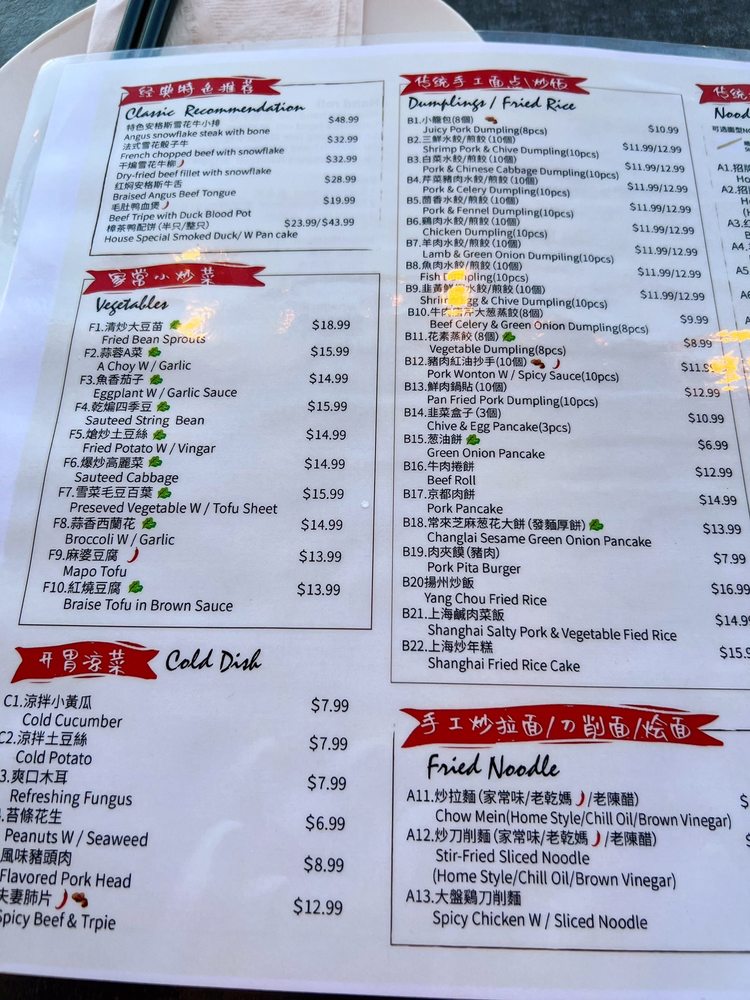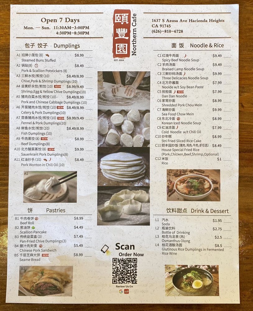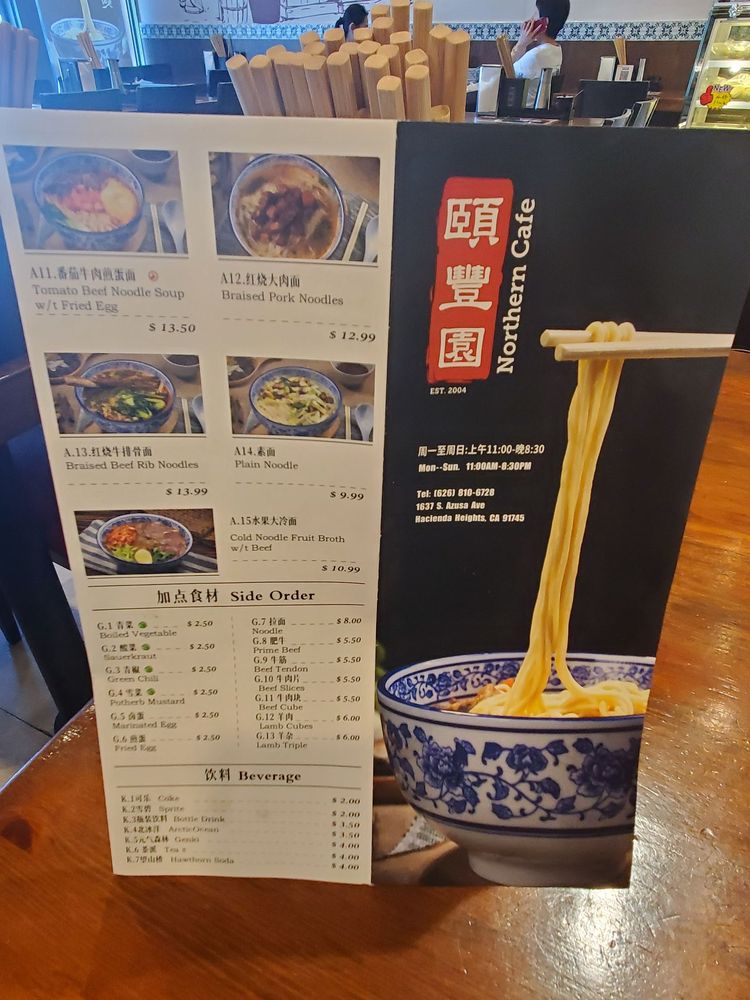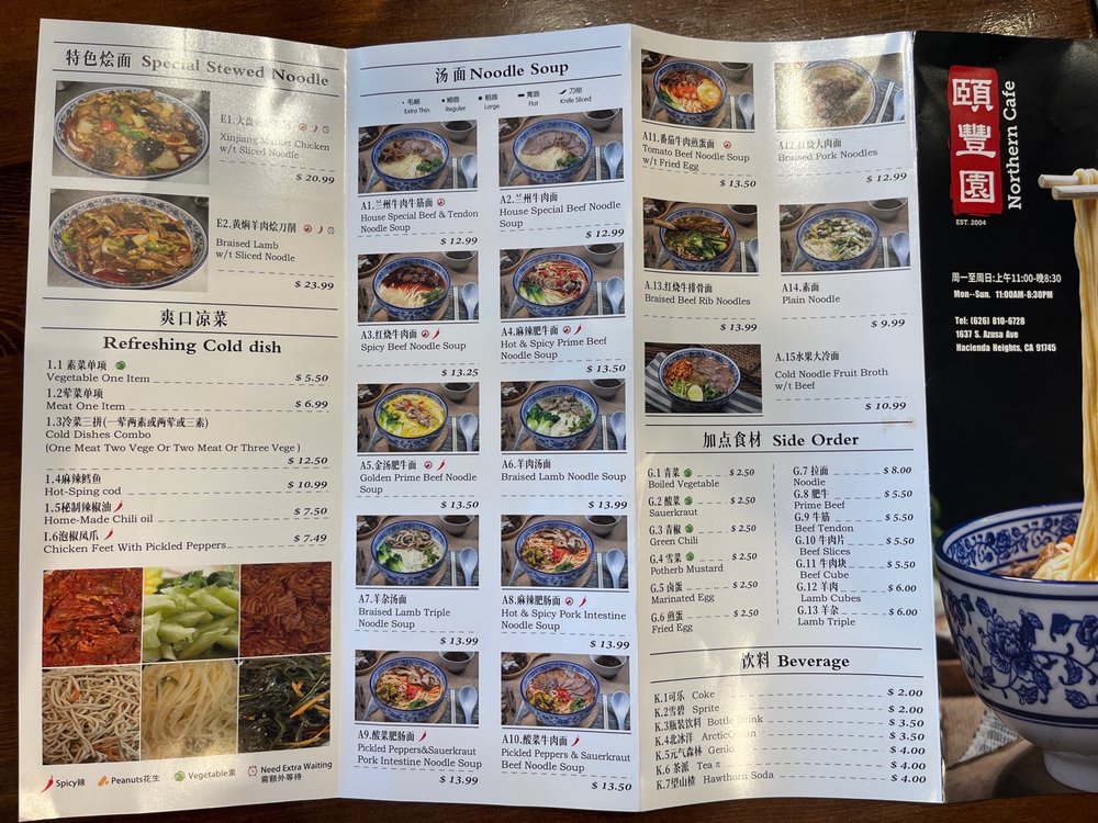 Introducing the menu at Northern Cafe, a hidden gem located in Hacienda Heights, CA. This casual dining spot offers a variety of Chinese dishes, with a focus on authentic handmade noodles and dumplings. From cold dishes like Vegetable One Item and Meat One Item, to flavorful Noodle Soups such as House Special Beef Noodle Soup and Braised Lamb Triple Noodle Soup, there is something for every palate. Don't miss out on their Special Stewed Noodle options like Xinjiang Market Chicken with Sliced Noodle Special. Customers rave about the Golden Prime Beef Soup and the Pickled Peppers and Sauerkraut Beef Noodle Soup. With its generous portions, affordable prices, and attentive service, Northern Cafe is a must-visit for those craving delicious Chinese comfort food.